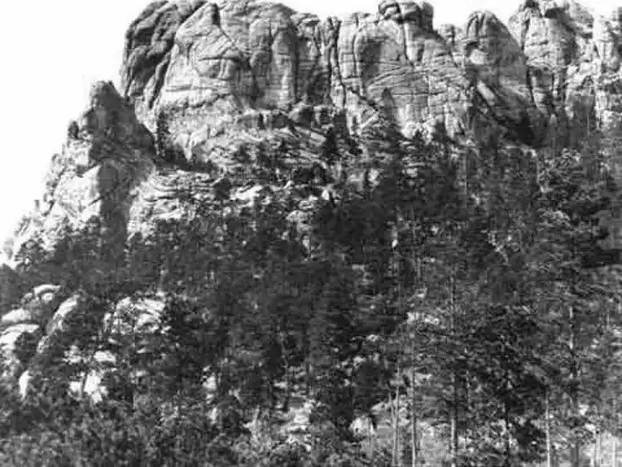 Гора Рашмор в 1905 году. Когда-то индейцы лакота, населявшие эту местность, называли гору «Шесть праотцов». В 1930 году она была переименована в честь Чарльза Рашмора, американского юриста из Нью-Йорка, который организовал экспедицию и впервые посетил эту местность в 1885 году. Строительство монумента началось в 1927 году и завершилось в 1941-м. Во время стройки не было летальных несчастных случаев, но некоторые рабочие умерли потом из-за болезней легких, вызванных гранитной пылью.