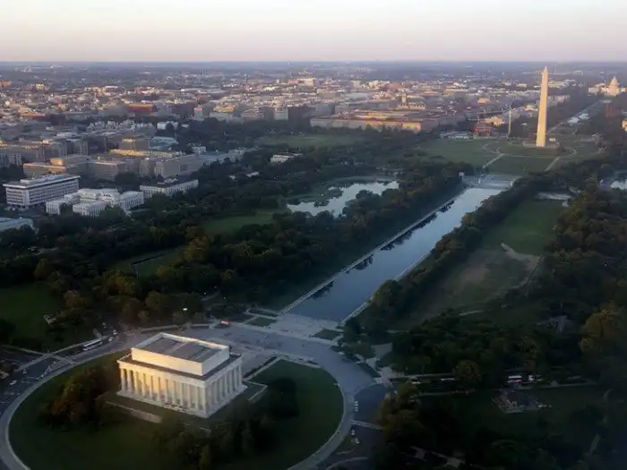 Мемориал Линкольна в 1917 году. Тогда никто не мог представить, что в 2000-х годах каждый год шесть миллионов человек будут посещать это место. Мемориал, расположенный на берегах реки Потомак, включает огромную статую сидящего Авраама Линкольна, две каменные плиты, на которых выгравированы тексты второго инаугурационного обращения Линкольна и его Геттисбергская речь. Болотистую местность позже превратят в искусственный водоем.