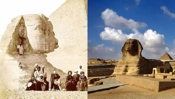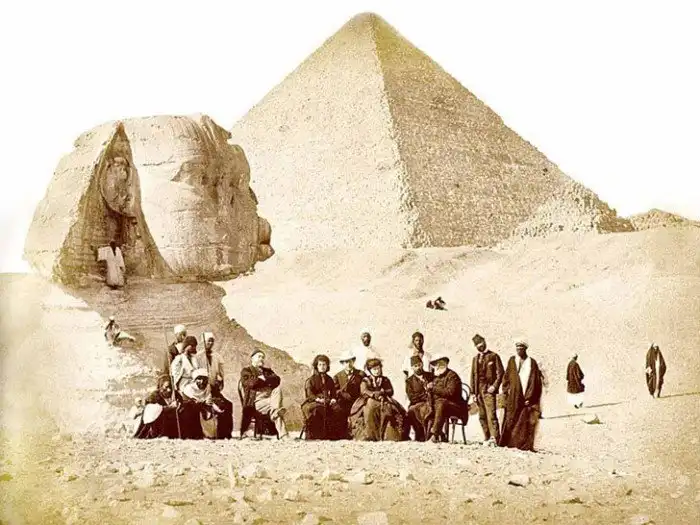 Большой сфинкс в Гизе в 1871 году. На фотографии позируют французский египтолог Огюст Мариет и император Бразилии Педру II с другими членами экспедиции.