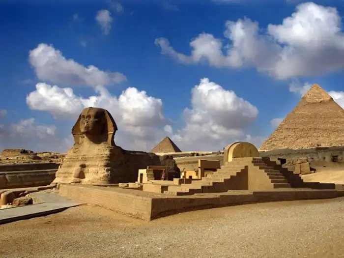 Большой сфинкс сейчас. На протяжении веков самая древняя из известных монументальных скульптур в мире повреждалась (у нее отвалился нос), откапывалась и увековечивалась. Сфинкс был вырезан из основания плато Гизы и раскопан французскими исследователями в начале 1900-х годов. Самая популярная версия его предназначения — он был возведен якобы для того, чтобы символизировать фараона Хафру (2558-2532 гг. до н. э.).