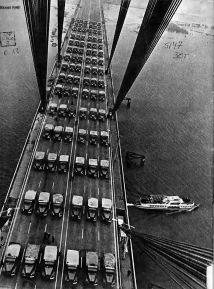 Испытание на прочность Московского моста УРСР, на мост вывезли 150 50 КрАЗов, кузова которых были доверху загружены песком. При чем этого веса было выше нормы.