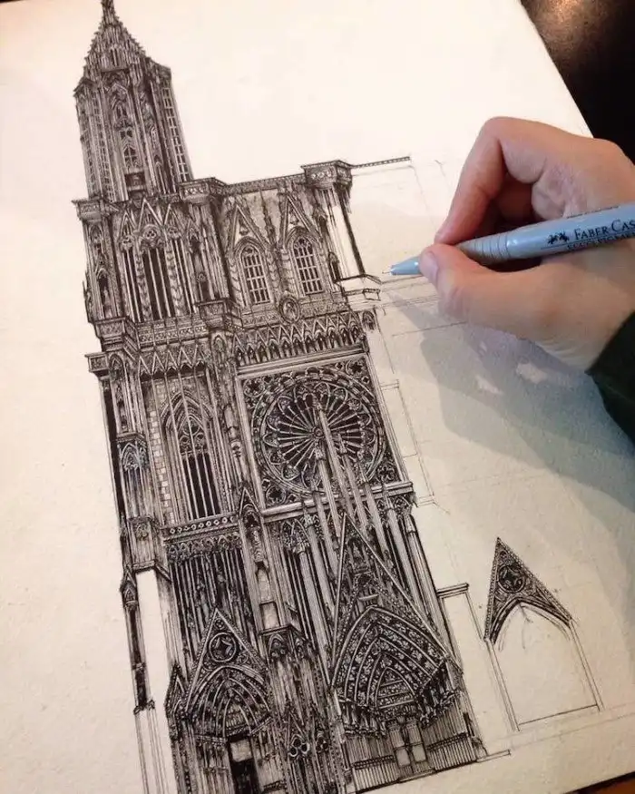 Живущая в Таиланде художница называет себя путешественницей по мечте. С помощью чернильной ручки девушка невероятно реалистично воспроизводит массивы замысловатых архитектурных деталей.