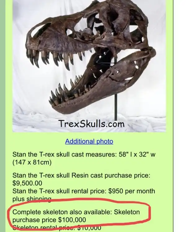 За вот такой слепок скелета тираннозавра Стэна (один из самых полных скелетов тираннозавров) просят 100 тысяч долларов или почти 6,8 миллионов рублей.