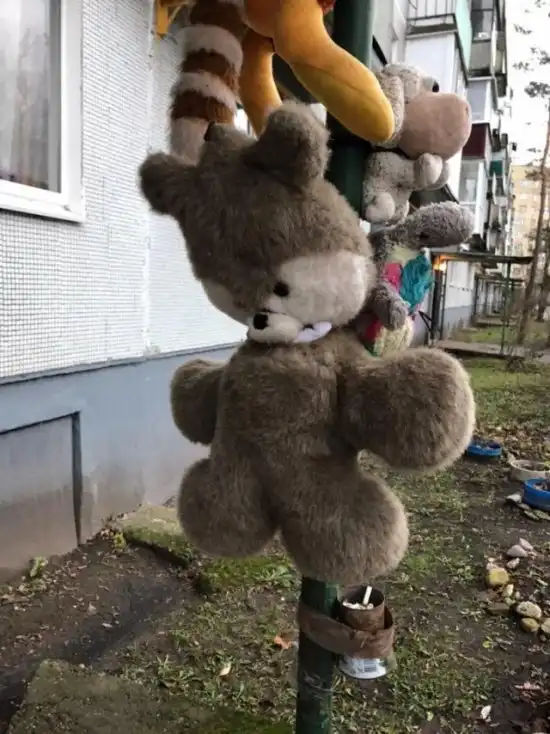Хоть кто-то считает, что такой способ украсить двор является вполне адекватным, в действительности смотрится все это весьма жутко. Как говорится, зачем красить обшарпанные стены, делать ремонт входной группы, когда можно просто развесить старые мягкие игрушки на входе - и готово.