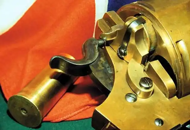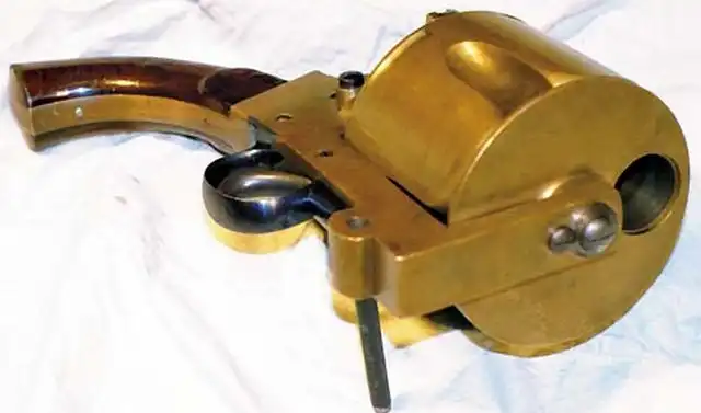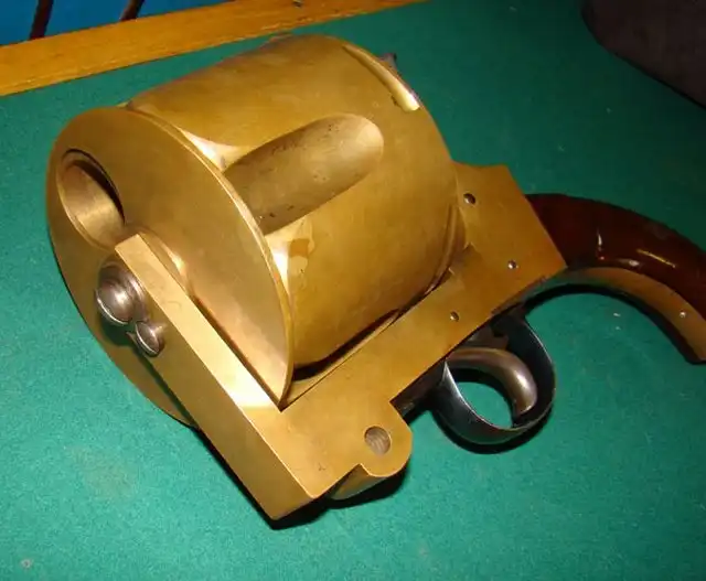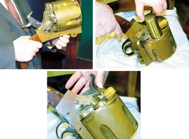 Револьвер выглядит очень внушительно, но это и неудивительно, ведь его масса составляет 9,5 килограмм, а калибр - 37 мм! Передняя часть пятизарядного барабана закрыта, а лишь только верхняя камора открыта.