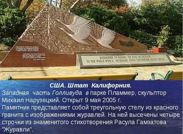 Каждый год в Лос-Анджелесском районе Западный Голливуд около пяти сотен ветеранов Великой Отечественной войны 9-го мая отмечают День Победы в местном парке Пламмер. Они отправили коллективный запрос властям на установку памятника, и городские чиновники установили его. На 7-тонной плите из красного гранита отображены белые журавли, а также написаны строчки Расула Гамзатова.