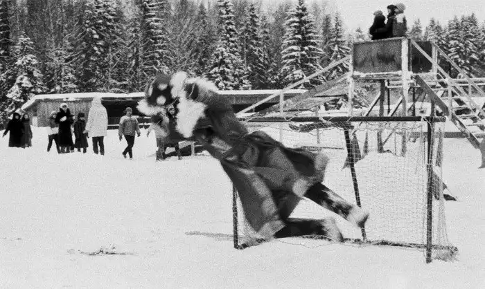 Дед Мороз – по совместительству вратарь. Павел Сухарев, 5 - 18 января 1986 года, Московская обл., Рузский р-н, дер. Федчино, из архива Павла Сергеевича Сухарева.