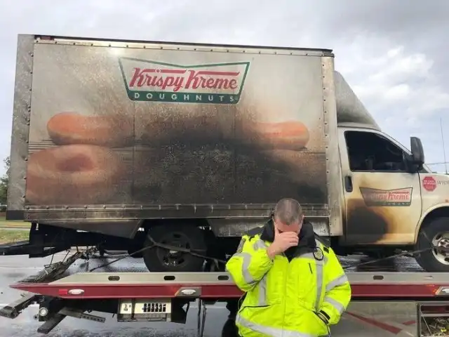 Полицейские из Кентукки опубликовали в сети "трогательные" фотографии сгоревшего грузовика с пончиками. Как выяснилось, весь ценный груз был уничтожен огнем. На эти снимки отозвались полицейские со всей Америки, которые начали высказывать соболезнования своим коллегам.