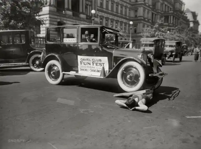 Силач демонстрирует свое умение выдерживать вес автомобиля на фестивале Fun Fest, Вашингтон, 1923 год.
