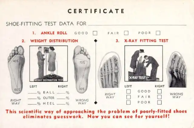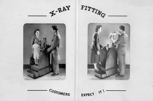 Это устройство под названием "педоскоп" стало очень популярным в первой половине ХХ века, когда в обувных магазинах начали просвечивать обувь рентгеном. Его принцип работы был весьма простым: клиент вставлял свою ногу в отверстие и через специальную трубку видел, насколько плотно на ноге сидит башмак. Аппарат просвечивал ногу полностью, поэтому можно было даже разглядеть каждую косточку.