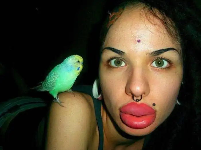Попугай на плече этой девушки реально растерян, так как он не совсем понимает во что она превратила свой рот