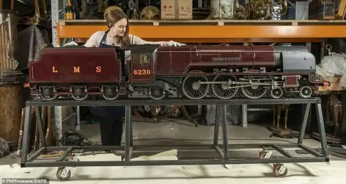 Эта 3-метровая копия парового локомотива была изготовлена в 1970-х годах Гарри Пауэллом. Он использовал чертежи реально существовавшего поезда "Герцогиня Баклю", который с 1939 по 1963 год работал на железнодорожной линии Лондон-Глазго. Сейчас модель, на создание которой у Пауэлла ушло 10 лет, выставлена на аукцион за рекордную стоимость.
