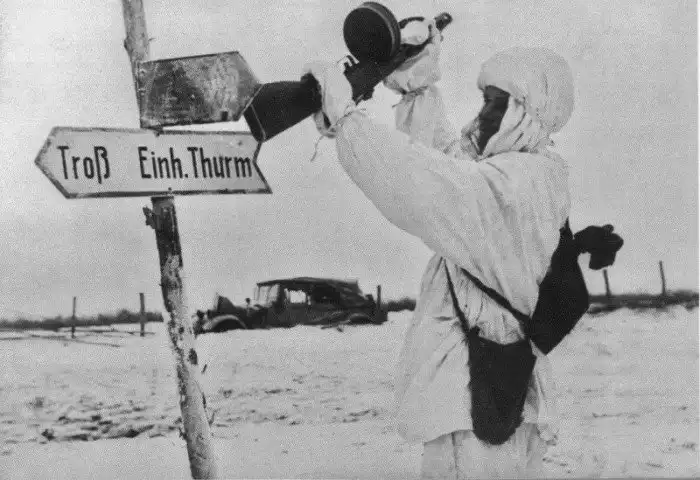 Советский солдат сбивает прикладом автомата немецкий дорожный указатель. Фотография сделана в период операции по окончательному снятию блокады Ленинграда (операция «Январский гром»). Ленинградская область, январь 1944 года.