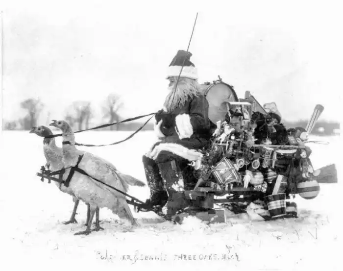 15. Санта-Клаус с подарками на санях запряженных индюшками, Мичиган, 1909 год.