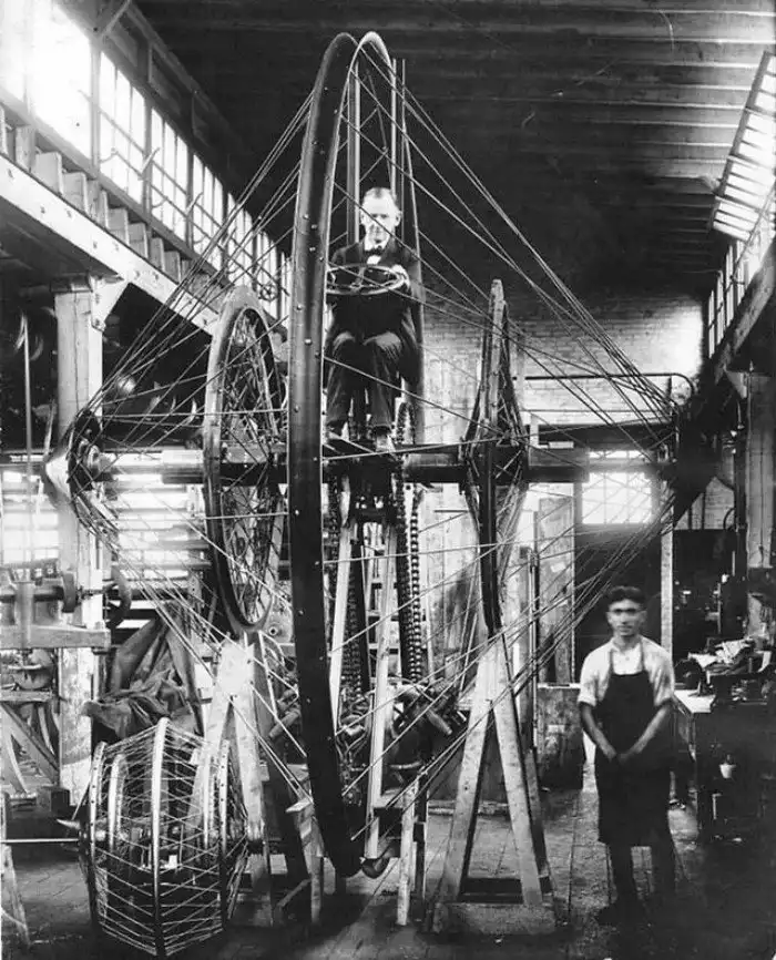24. Профессор Кристи за рулем своего гигантского моноцикла, Огайо, 1920 год.