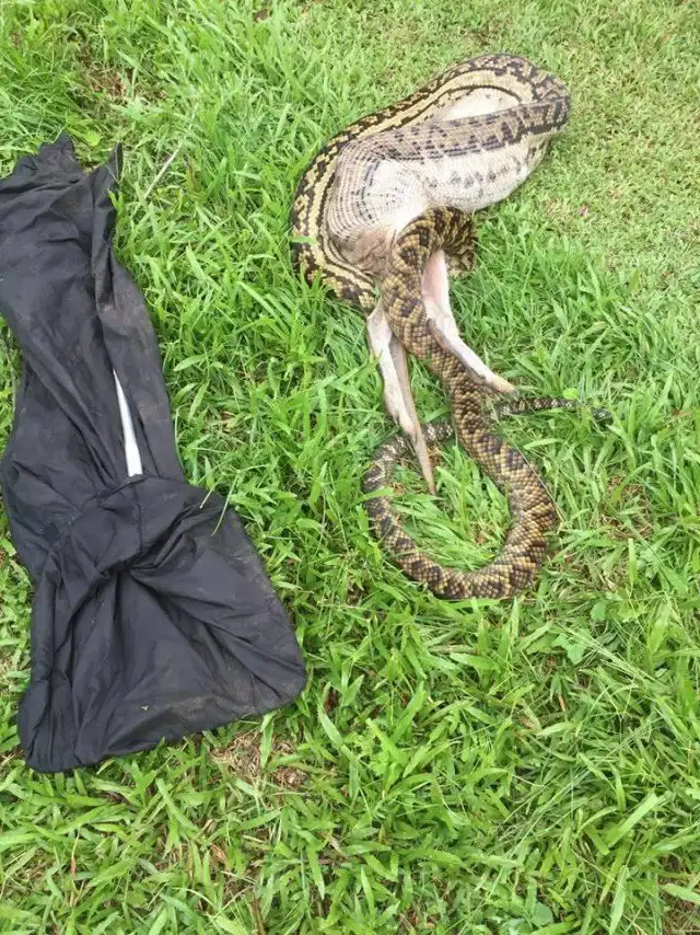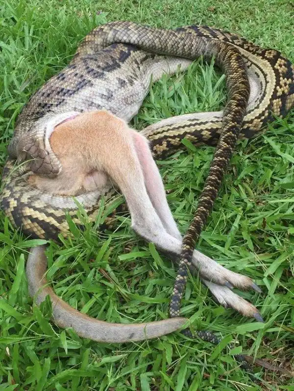 В австралийском штате Квинсленд аместитовый питон задушил и проглотил кустарникового кенгуру валлаби. Теперь самая большая австралийская змея несколько месяцев может обходиться без еды, переваривая 20 килограммовое животное.