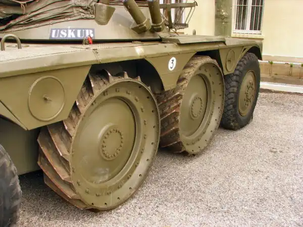 Передние и задние пары колёс снабжены пулестойкими пневматическими шинами, а средние пары колёс — тракторного типа (которые при движении по хорошим дорогам могут подниматься, а при движении вне дорог — опускаться).