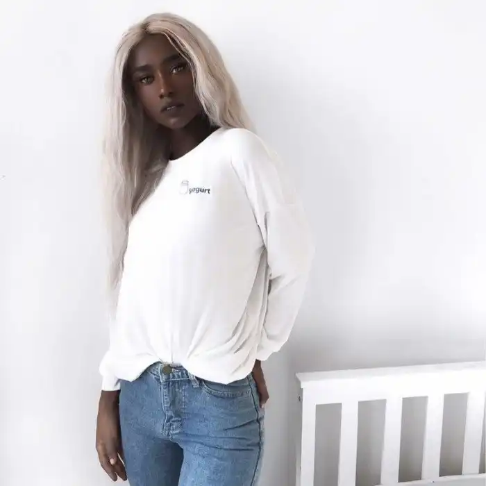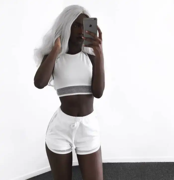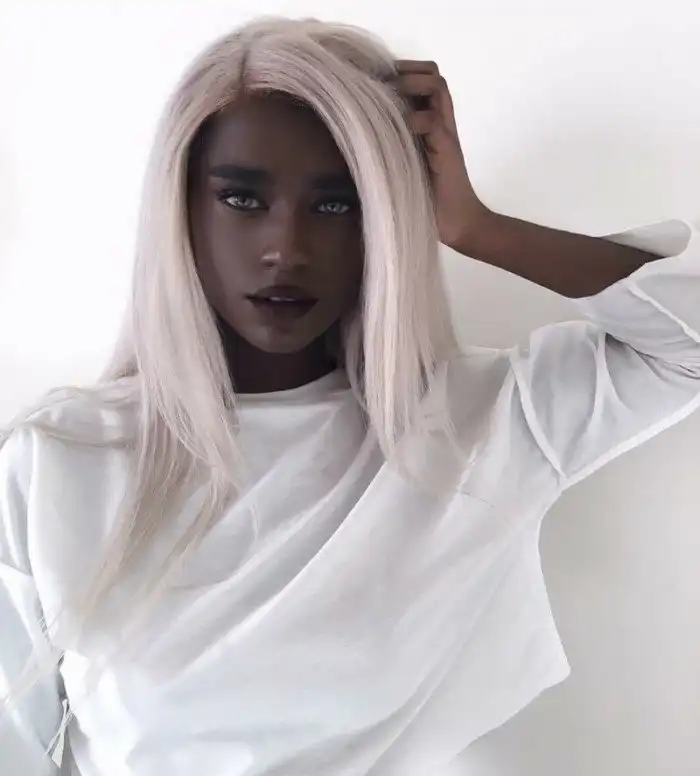 Модель из Гамбии, известная в Инстаграм под именем Melvnin, обладает необычной внешностью. Очень темная, почти черная кожа, в сочетании со светлыми глазами и белыми, как снег, волосами создают воистину образ неземной девушки из иного мира или из далекого космоса.