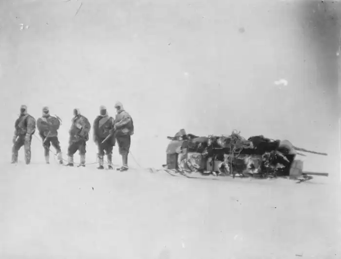 1907. Участники экспедиции с загруженными санями, Антарктида. Британская антарктическая экспедиция 1907-1909 гг