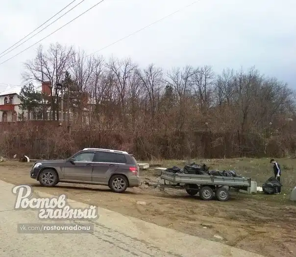 Дамба на СЖМ в Ростове возле старого кафе. Мужчина с двумя парнями (скорее всего сыновьями) приехал на мерседесе и расчистил поляну от мусора - бутылок, пакетов и т.п. Набрался целый прицеп. Потрудились и полностью очистили поляну. Благородные люди, спасибо им...