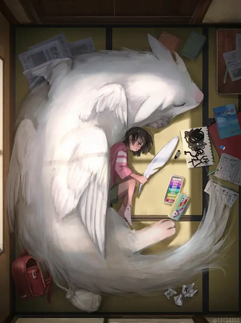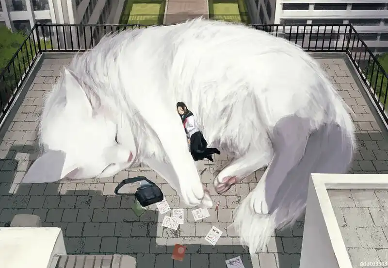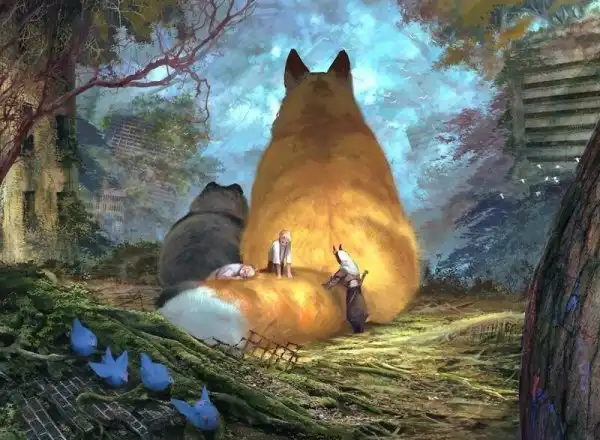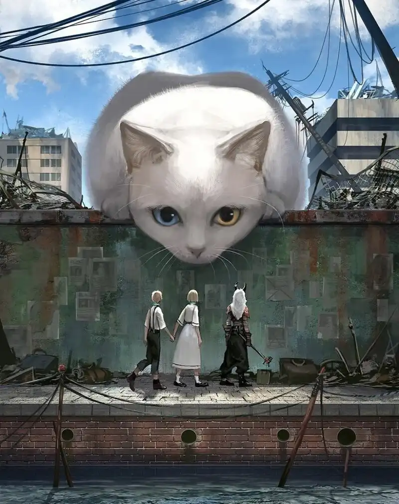 Этот загадочный японский художник, которого в соцсетях знают по псевдониму Ariduka55, создаёт фантастические иллюстрации с мирами, в которых гигантские животные живут и развиваются вместе с людьми. Эти его работы навеяны ему нашим обычным миром, с одним лишь только отличием — все маленькие животные, а это кошки, собаки, кролики, совы, еноты, на его картинах имеют размеры, которые можно сопоставить с 3-этажным зданием.