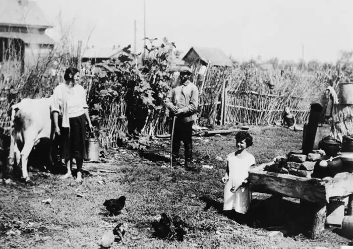 Колхозник Моисей Гефен с женой Шейной и их дочерью ухаживают за приусадебным участком в Биробиджане