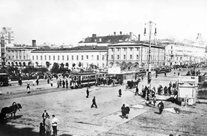 Вид на трамваи и автобусы в центре Москвы