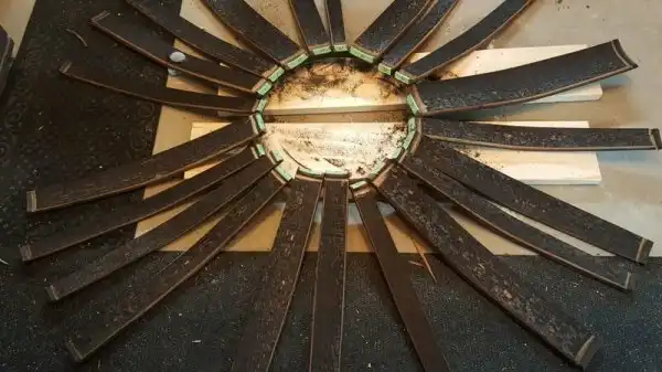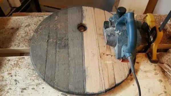 Бочка потемнела, доски рассохлись, а обручи поржавели. Задача мастера была реставрировать бочку, но при этом оставить ей вид под старину.