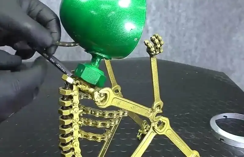 Для создания данного светильника автор использовал:фару ФР-100,разнообразные гаечные ключи, цепи от велосипеда и мопеда, гайки, шнур, выключатель, разнообразные аэрозольные краски, светодиодная лампа на 220 вольт.