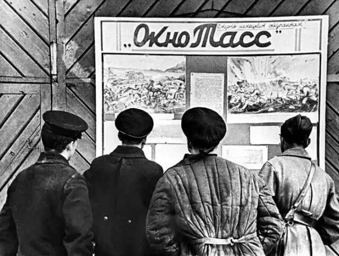 Агитационный плакат для поднятия боевого духа "Окно ТАСС", в поселке Осиновец на западном берегу Ладожского озера, 1941 год