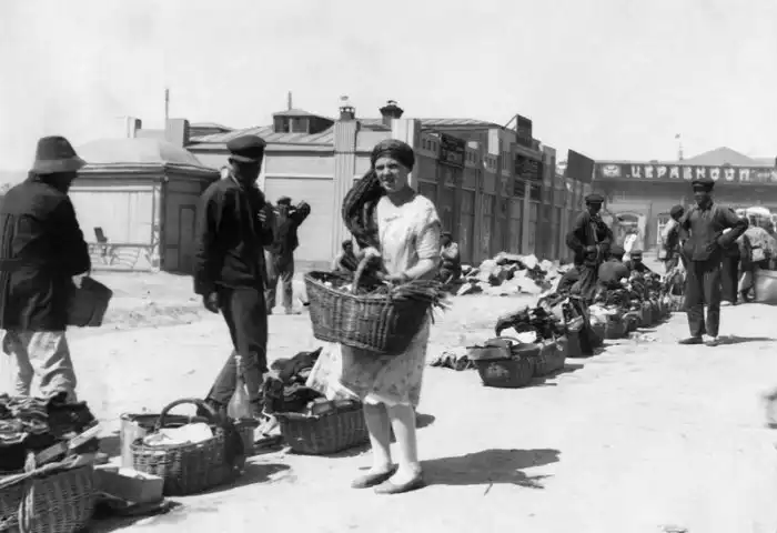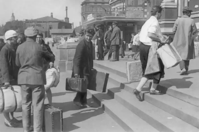 8. Курский вокзал, путешественники с чемоданами перед станцией
