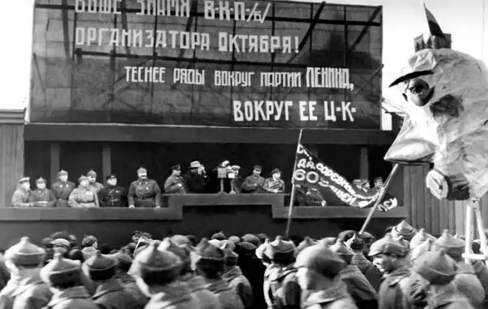 22. Празднование 12-й годовщины революции. Иосиф Сталин, Николай Бухарин и другие советские государственные деятели на трибуне