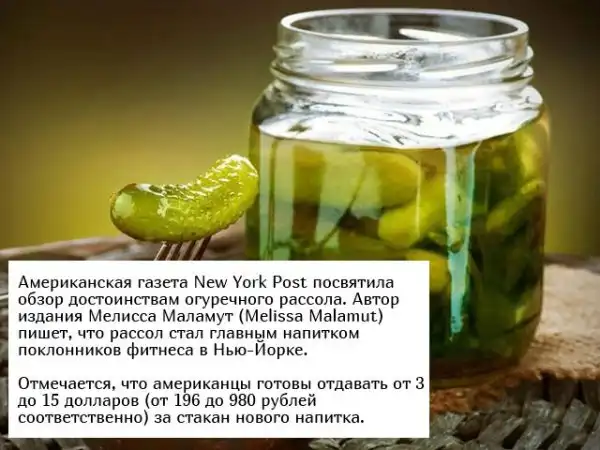 Что может быть лучше огуречного рассола с утра, если вы хорошо погуляли вчера вечером? Даже американцы оценили чудодейственные свойства рассола, о чем написала газета "New York Post". По словам журналистов, рассол стал главным напитком поклонников фитнеса в Нью-Йорке.