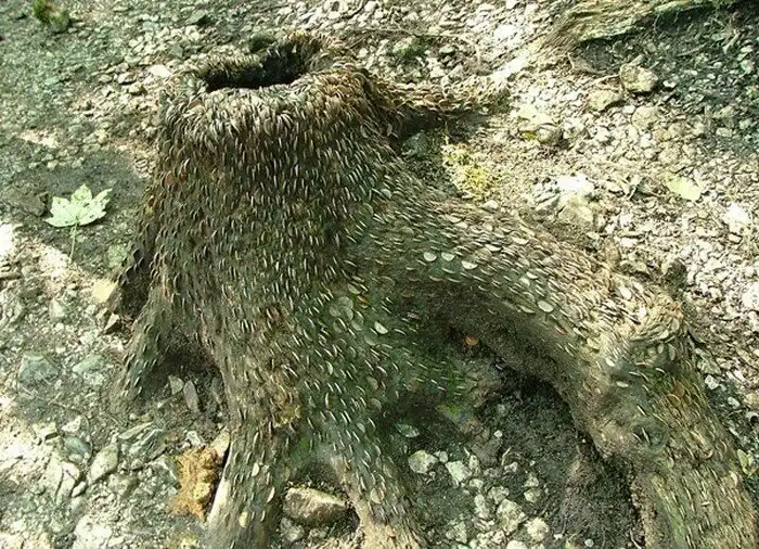 Кора срубленных деревьев (многие из них уже очень старые) буквально "окутана" сеткой из монет, которые жители вбивали при помощи молотков, камней и прочего подручного материала