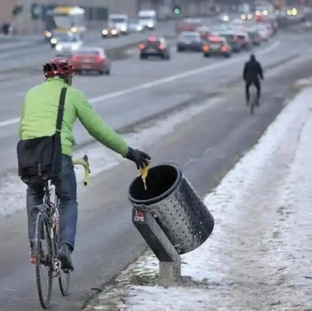 Ни для кого не секрет, что Копенгаген по праву может считаться одной из велосипедных столиц мира. Там все продумано для удобства велосипедистов, включая дорожки, продуманные парковки и даже вот такие специальные урны.