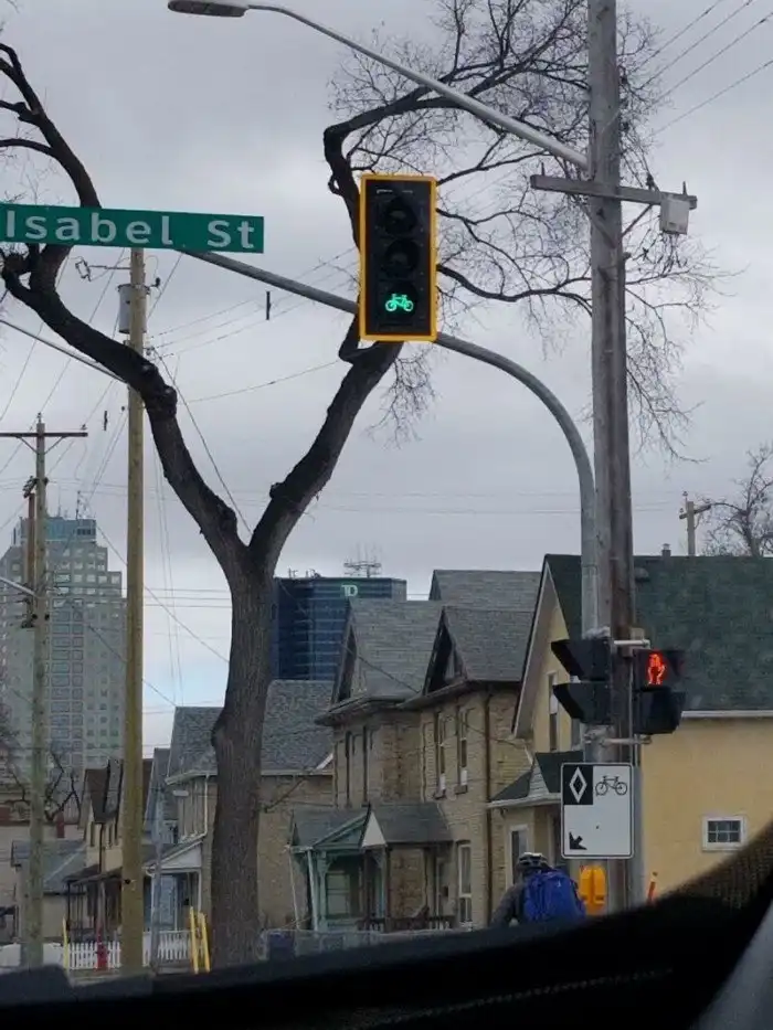 На этом перекрестке рядом с конюшней у светофора 2 кнопки, чтобы переключить сигнал на зеленый. Одна - для пешеходов, другая - для всадников.