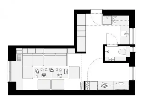 Вторая маленькая комната является кабинетом, но при необходимости может выступать в качестве второй спальни. Для организации дополнительных спальных мест используются те же складные кресла из первой комнаты. Кроме этого, в квартире имеются кухня и ванная комната. По мнению автора проекта, получившийся результат выполняет функции, для которых в обычном жилье требуется в 2 раза большая площадь.