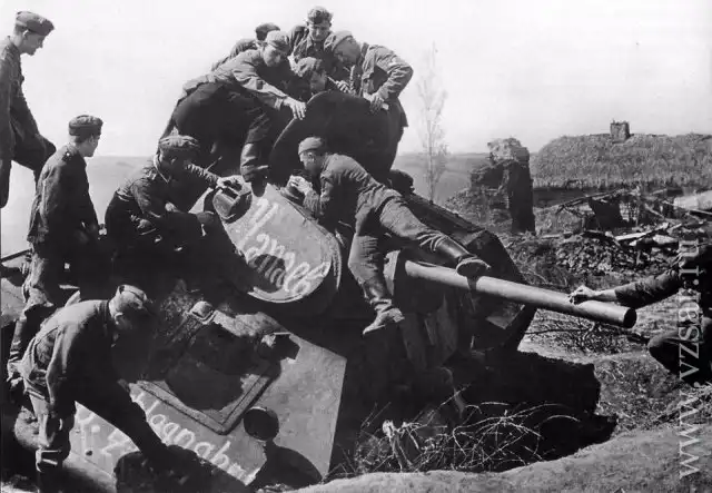 По словам одного из очевидцев, на одном из фото, сделанном под Харьковом в 1942 году, немецкие солдаты осматривают подбитый советский танк Т-34.