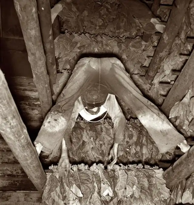 Сын фермера-арендатора вывешивает табачные листья для сушки, Северная Каролина, июль 1939 года