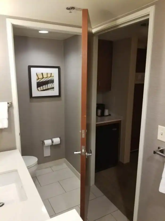 Дверь в номере отеля, которая может отгородить от основного номера либо туалет, либо ванную целиком