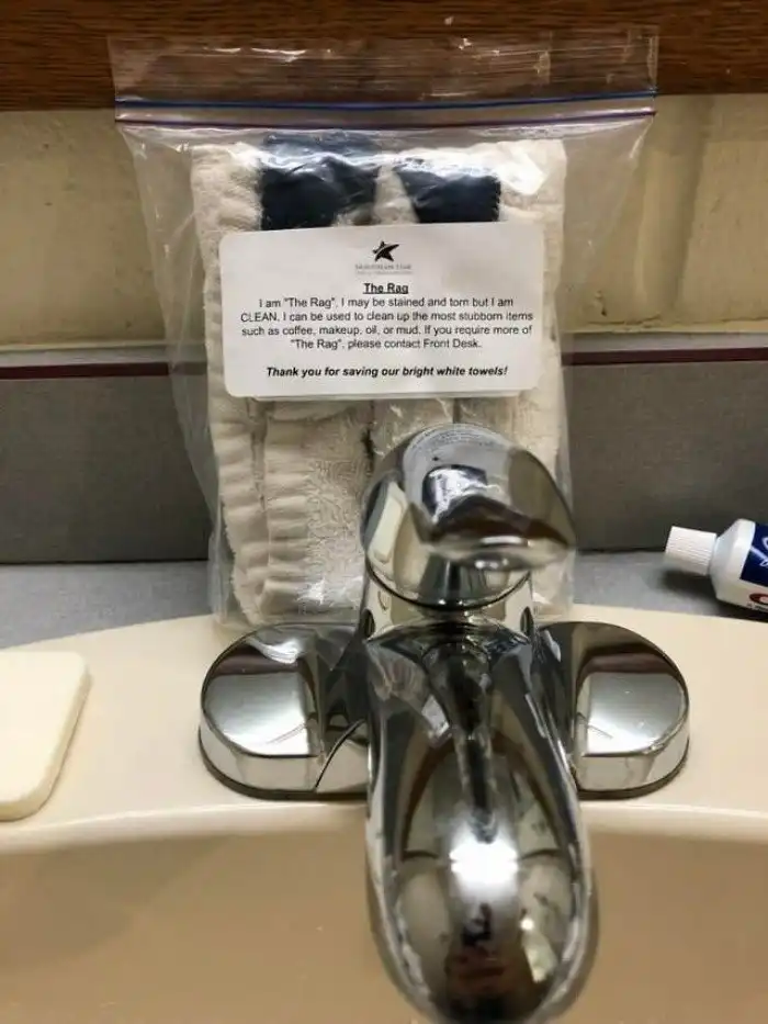 Отель, где клиенту выдают чистую ветошь, чтобы, в случае необходимости, стереть с мебели или вещей трудно смываемые пятна - от кофе, косметики, масла или грязи. Зато гостиничные полотенцв останутся чистыми!