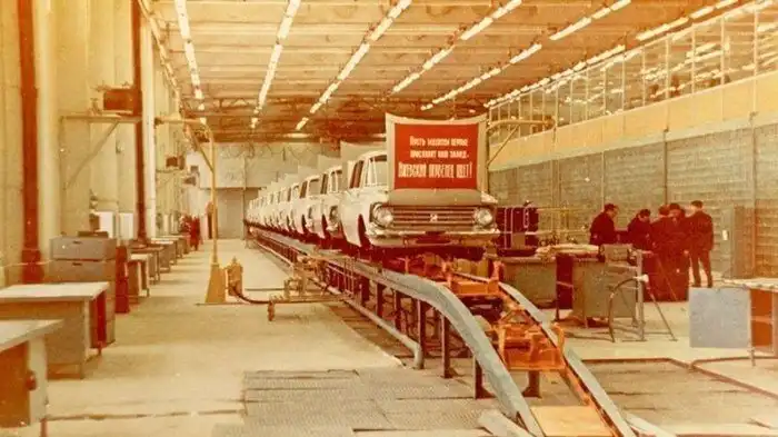 21. Первые легковые автомобили Москвич-408 на сборочном конвейере Ижевского автомобильного завода. 12 декабря 1966 года