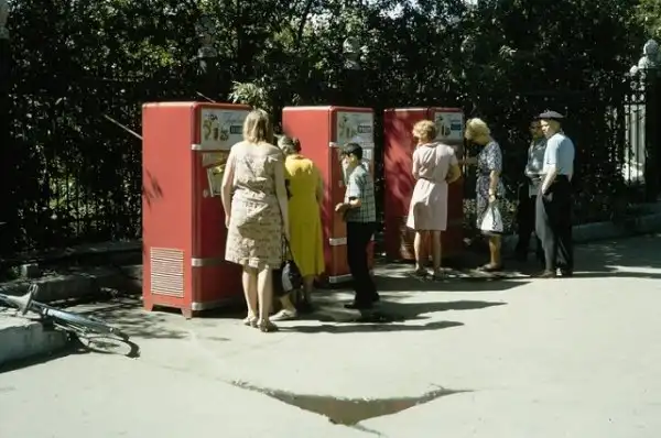 Автоматы с газированной водой устанавливали по несколько штук в ряд, потому что каждый их них был рассчитан всего на пару видов напитков. Возле автоматов всегда стояла очередь, особенно в жаркое время года.