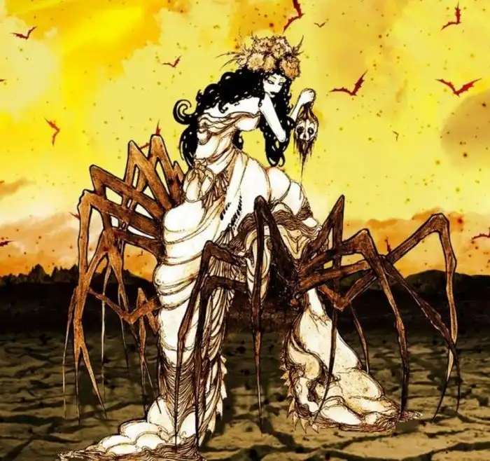 Сверху это привлекательная женщина, а вот конечности у нее паучьи. Йорогумо заманивает мужчин куда-нибудь и играет на музыкальном инструменте под названием бива. Музыка завораживает слушателя, а монстр в это время обездвиживает его паутиной и съедает. Существо способно звать и контролировать других пауков.