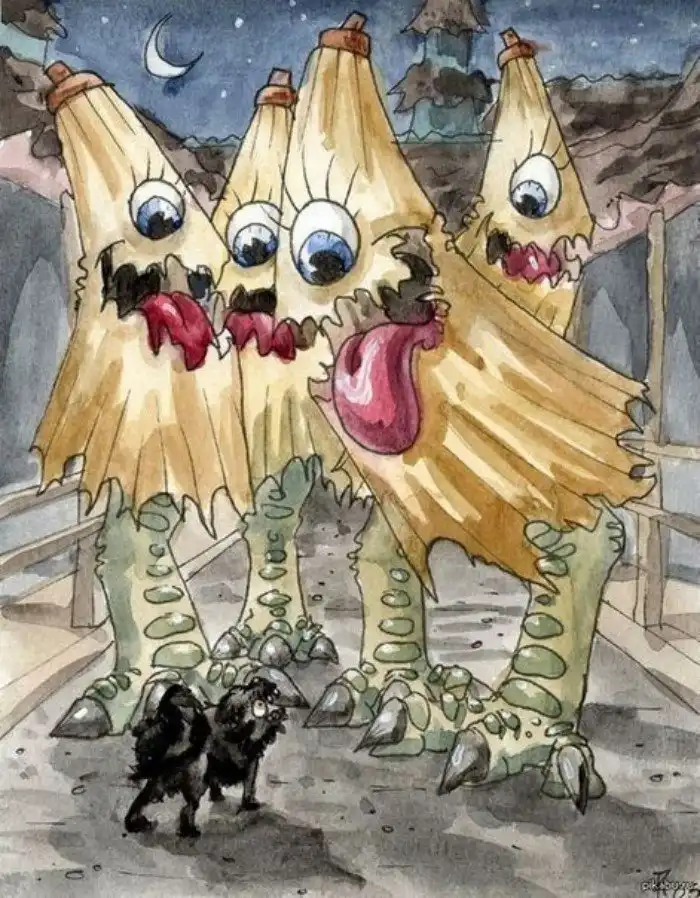 Наверное, самый чудной монстр из всего списка, выглядящий как одноглазый старый зонт с одной ногой и большим языком. Мифический призрак встречается в видеоиграх, комиксах, кино. Он безобиден, но непослушен. Каса-обакэ любит дурачиться, подпрыгивать на одной ноге и подшучивать над людьми.