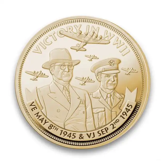 "После четырех долгих лет войны и жертв союзники наконец одержали победу. Величайшему поколению настало время торжествовать и размышлять о потерях и приобретениях этой войны, а также о светлом свободном будущем, лежащим впереди. Теперь вспомните обо всех тех, кто защитил нашу нынешнюю свободу, с нашей юбилейной монетой 75-летия победы во Второй мировой войне. На аверсе изображены флаги наций-союзников: Соединенных Штатов, Великобритании и Франции, а также даты годовщины", - говорится в описании.
