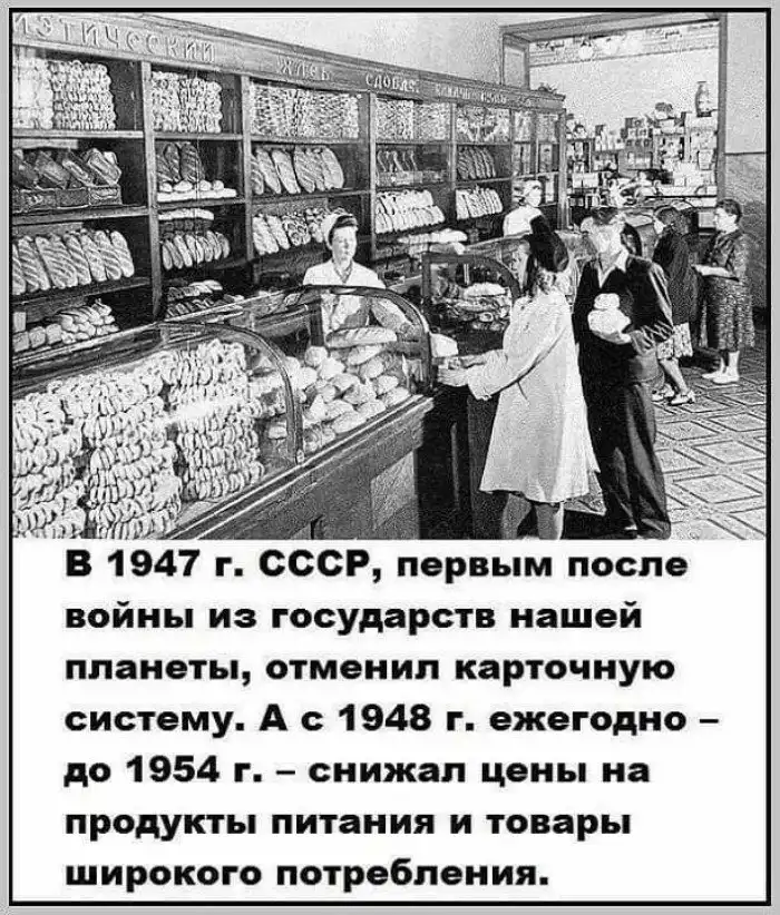 Страна активно восстанавливалась. Уже к декабрю 1947 года была отменена карточная система. Для сравнения - в Великобритании карточки на продовольствие отменили только в 1954 году. Начиная с 1947 года цены в СССР снижались ежегодно.