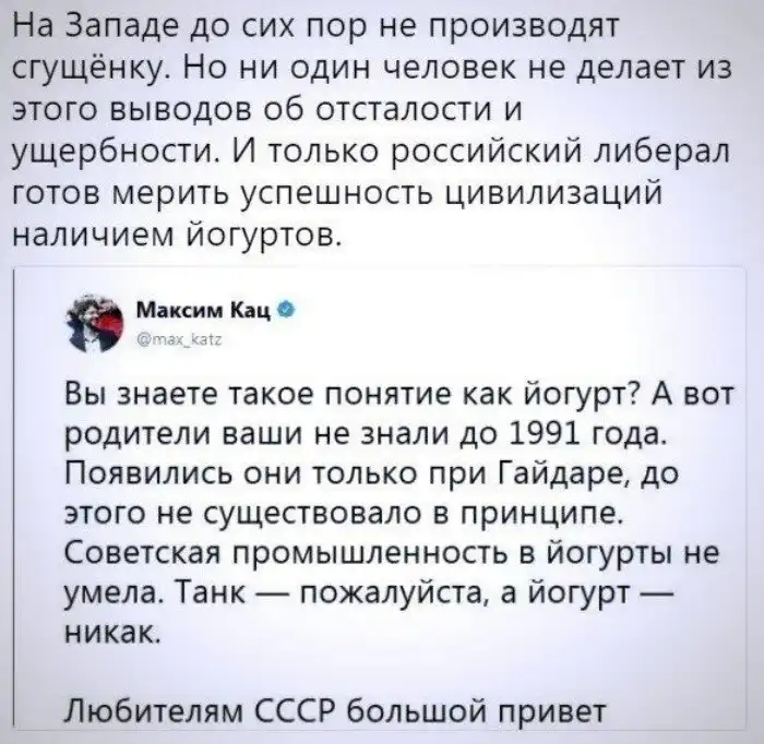 Ситуацию можно было бы улучшить жесткой борьбой с коррупцией. Но андроповский порыв закончился с его смертью, а вскоре к власти пришел Горбачев. И начались чудеса! Еще в 1987 году производство продуктов питания росло опережающими темпами по сравнению с ростом численности населения и заработной платы. Прирост в мясной отрасли по сравнению с 1980 годом составил 135 процентов, в маслосыродельной - 131, в рыбной - 132, мукомольно-крупяной - 123. Средняя зарплата увеличилась на 19 процентов. Все предприятия пищевой промышленности работали на полную мощность и без перебоев. Но уже в конце 1988 года даже в Москве появились талоны. Именно этот период, когда люди устраивали мордобой в очередях за самым необходимым, и пытаются выдать за «позорную советскую действительность». Почему исчезли продукты? Во-первых, из-за непродуманного Закона о кооперации, который вылился в бесстыдную спекуляцию. Новая буржуазия скупала оптом продукты по госцене, давая взятку директору завода. В результате в магазины колбаса не попадала, зато втридорога продавалась в коммерческих палатках. А чадом от шашлыков в конце 80-х провоняла вся Москва, притом что мясо из универсамов испарилось окончательно.