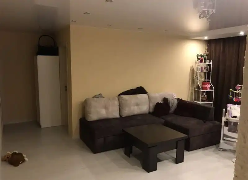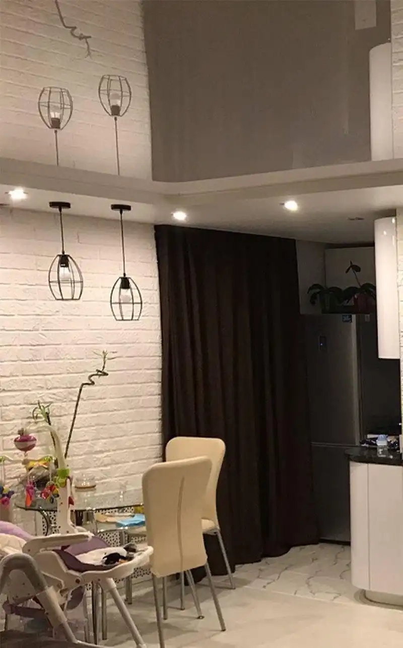 Не каждый решится сделать подвесные потолки в «хрущевке», но глава семейства рискнул и совсем не прогадал, ведь полотно для центральной части было белым и в глянце, а по краям гипсокартонный короб с точечными светильниками. Именно такой тандем позволил визуально расширить жизненное пространство особенно если учитывать, что мебельный гарнитур тоже имеет белые глянцевые фасады, то весь этот ансамбль привнес особый шарм и простор в обновленный интерьер.