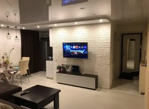 Для гостиной-столовой подобрали раскладной мягкий уголок, который в случае необходимости позволяет организовать спальное место для гостей. Там же на стену повесили большой телевизор, ставший украшением на белой кирпичной кладке, которой задекорированы некоторые стены обновленной квартиры. Открытая зона расширила функциональные возможности и площадь коридора, теперь узкие маленькие пространства уж точно не будут угнетать домочадцев.